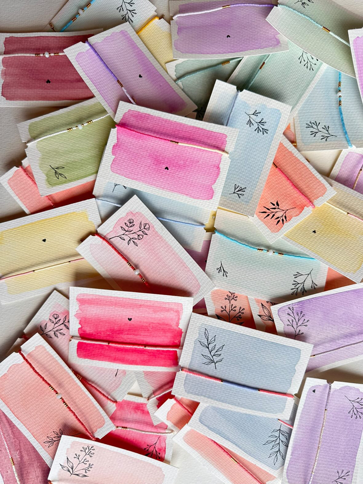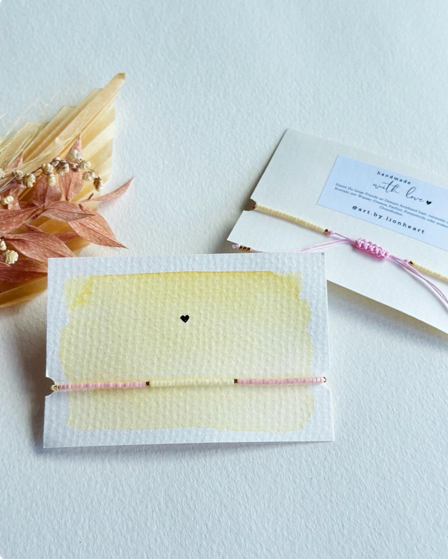 Filigranes Perlen-Armband in pastelligen Farben mit Zug-Verschluss von der wunderbaren Bonner Künstlerin art.by.lioheart. Jedes Papier, um das das Armband gewickelt ist ist mit Liebe & Aquarellfarben selbst gemalt. Sichere dir jetzt dein Einzelstück!